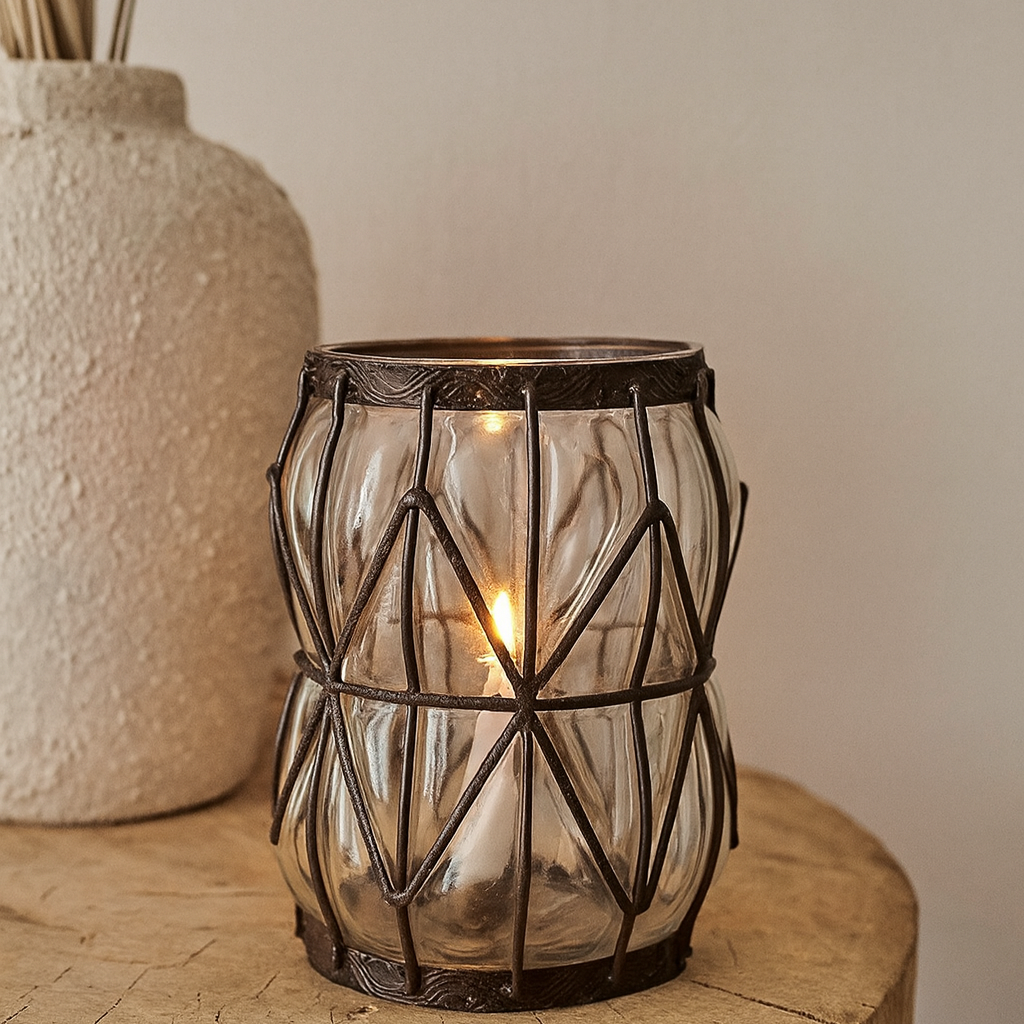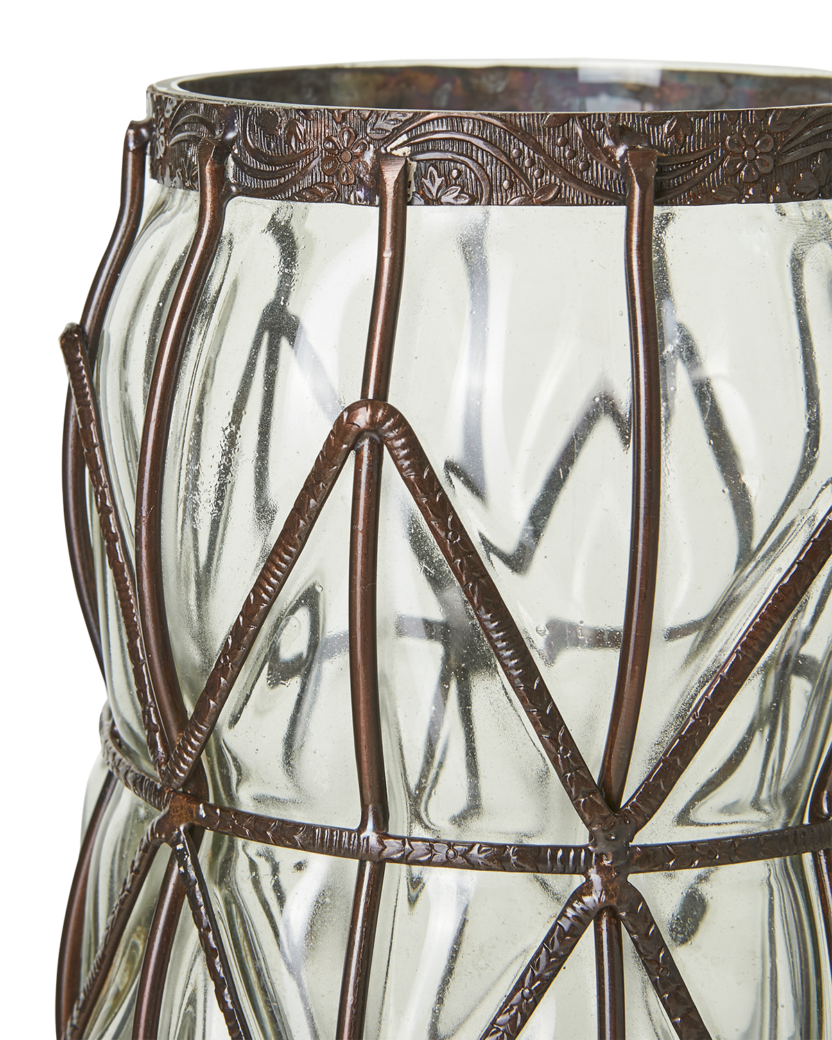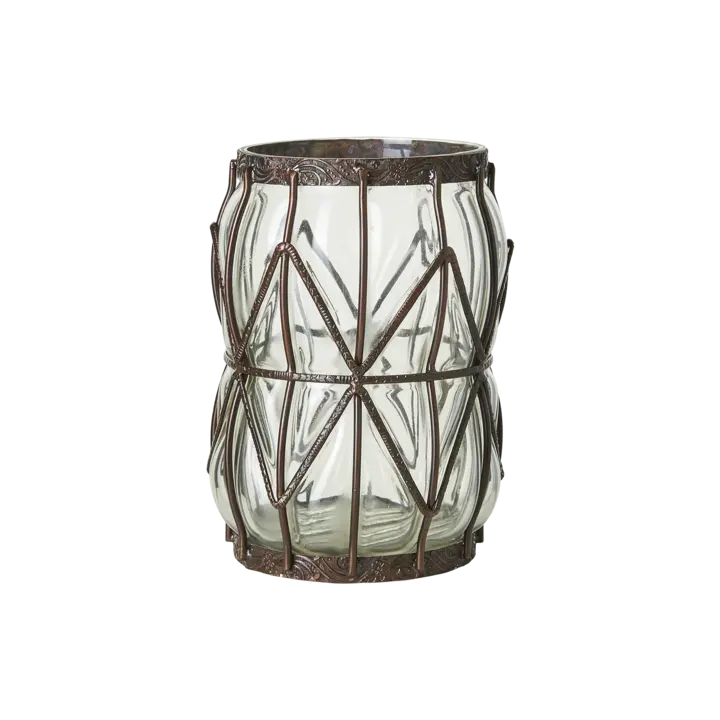 Vasen Belle är en vacker kombination av rustik charm och tidlös design. Den klara glaskroppen ramas in av dekorativa metallband i ett geometriskt mönster som ger en exklusiv känsla. Perfekt både som vas till färska eller torkade blommor och som ljuslykta för att skapa en stämningsfull atmosfär i hemmet.