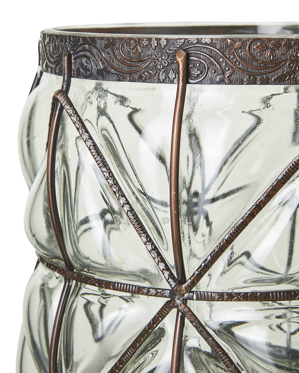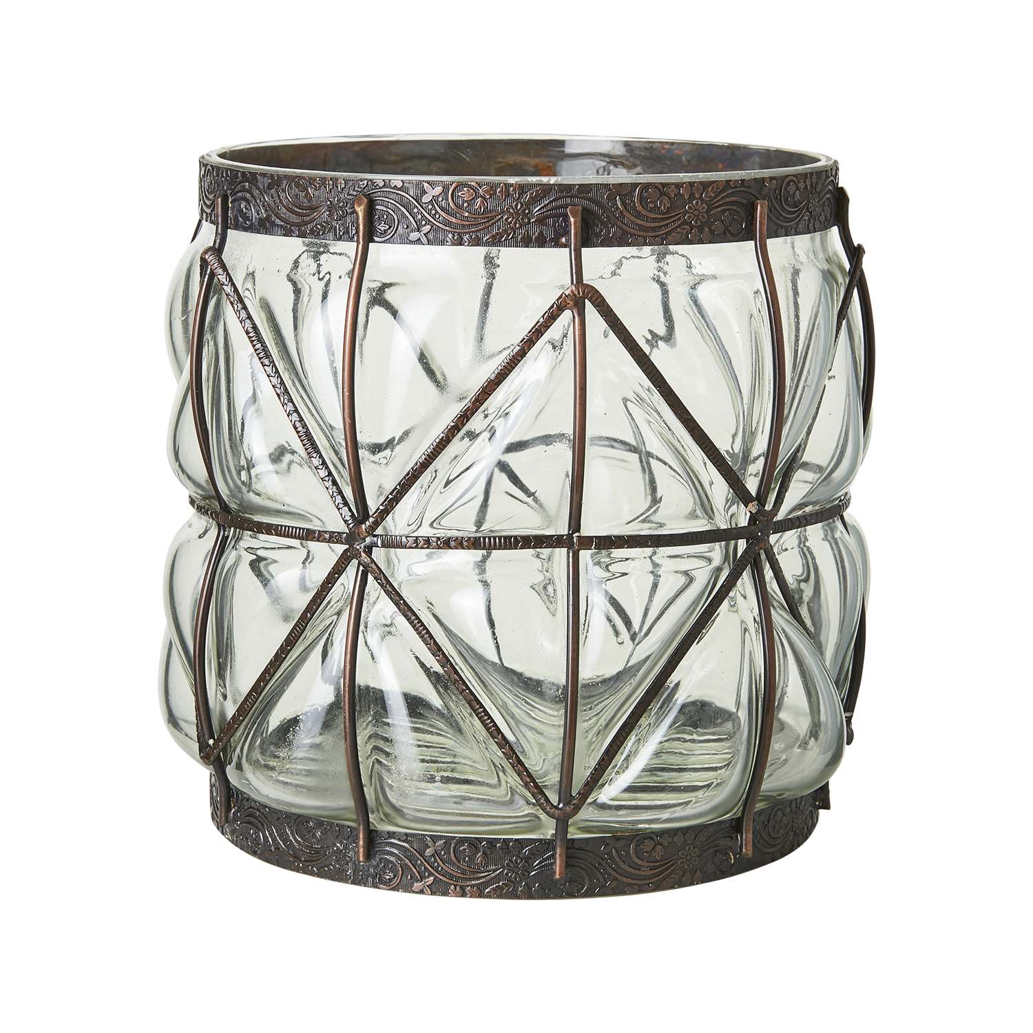 Vasen Belle är en vacker kombination av rustik charm och tidlös design. Den klara glaskroppen ramas in av dekorativa metallband i ett geometriskt mönster som ger en exklusiv känsla. Perfekt både som vas till färska eller torkade blommor och som ljuslykta för att skapa en stämningsfull atmosfär i hemmet.