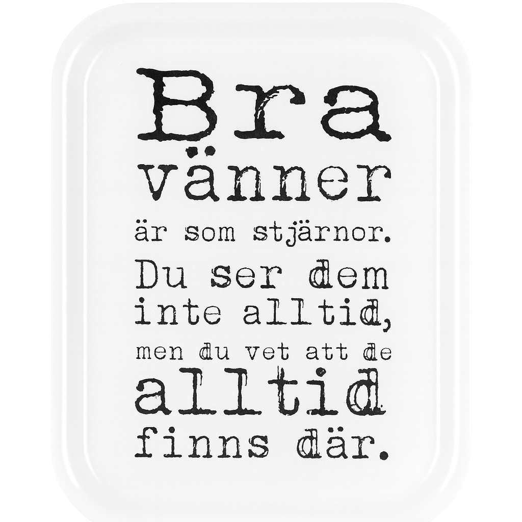 En bricka med värme och mening. Texten "Bra vänner är som stjärnor. Du ser dem inte alltid, men du vet att de alltid finns där." gör denna bricka från Mellow Design till mer än bara ett serveringsunderlag, det blir en påminnelse om vänskap och omtanke i vardagen. Perfekt för fika, frukost på sängen eller som en hjärtlig present till en nära vän .