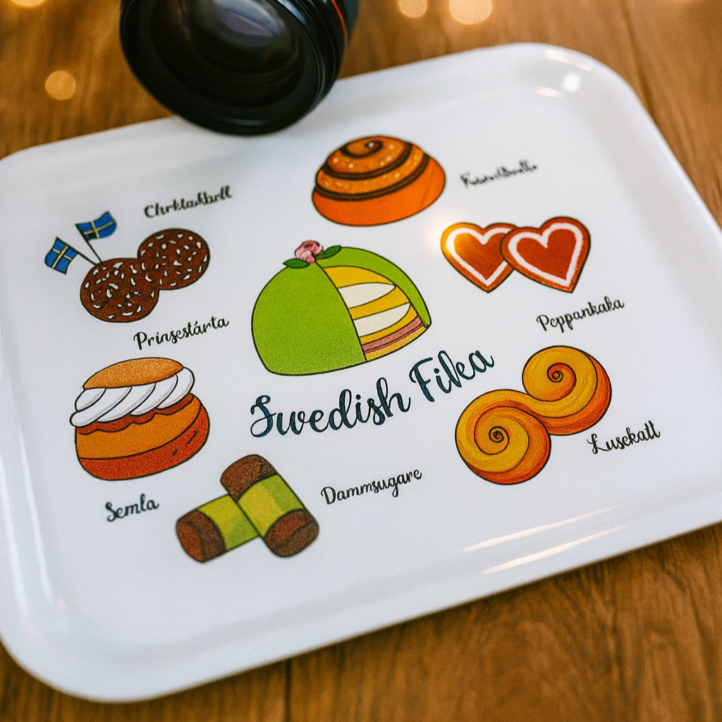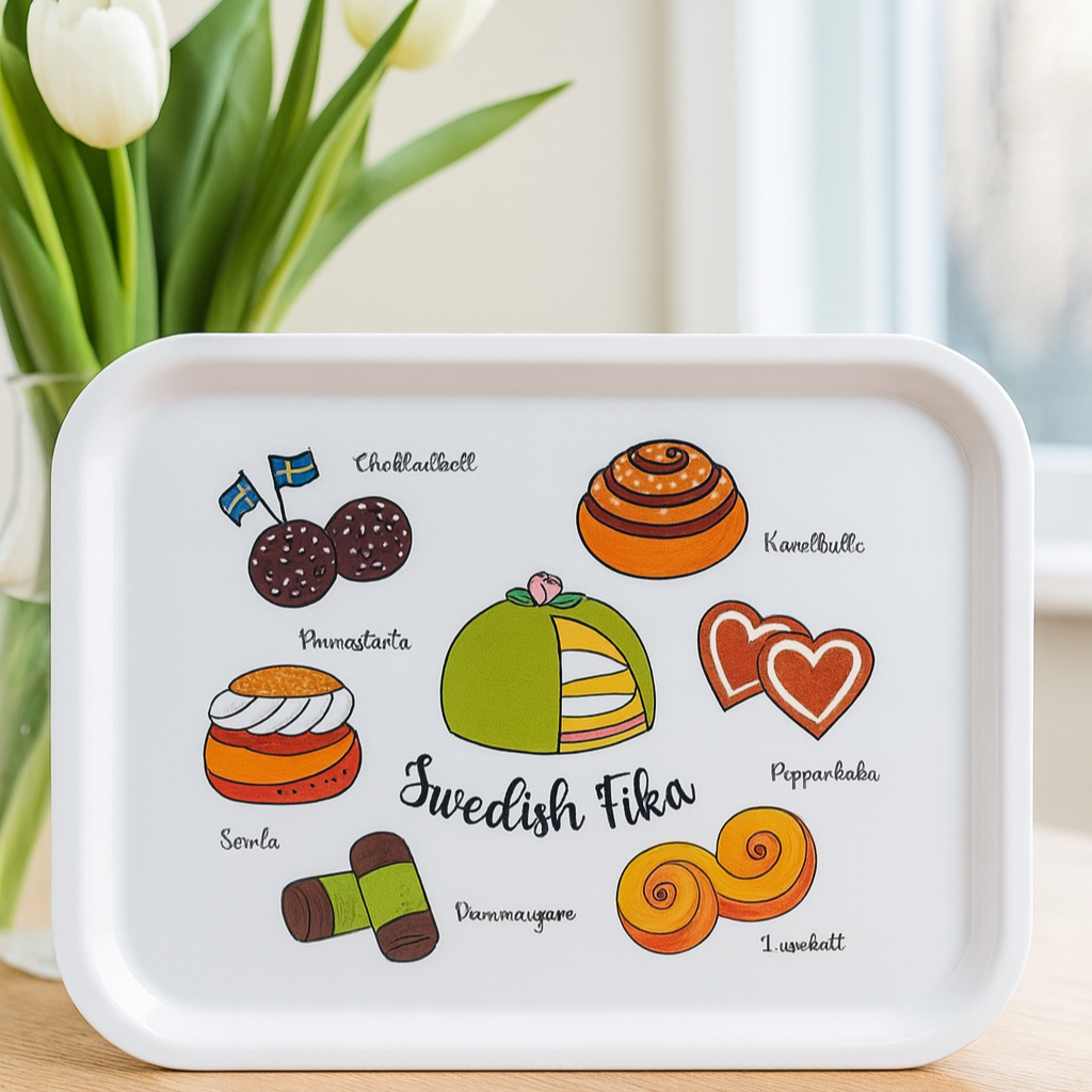 Fira den svenska fikakulturen med denna härliga bricka från Mellow Design . Med illustrationer av klassiska godsaker som kanelbulle, semla, prinsesstårta och chokladboll blir brickan både charmig och praktisk. Texten ”Swedish Fika” påminner om vår älskade tradition att ta en paus och njuta av något gott. En bricka som passar perfekt till kaffestunden, frukost på sängen eller som en dekorativ detalj i köket.