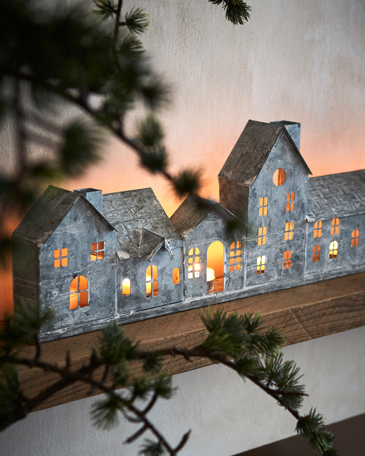 En charmig ljuslykta i form av små hus som skapar en varm och stämningsfull atmosfär. FENIX är tillverkad i grått metallmaterial med en vackert väderbiten yta som ger en rustik och industriell känsla. När du tänder ljus inuti sprider de små fönstren ett mjukt sken som påminner om ett stillsamt vinterkvarter – perfekt för att skapa mys hemma året runt.