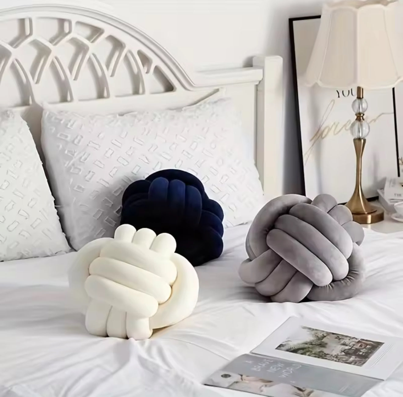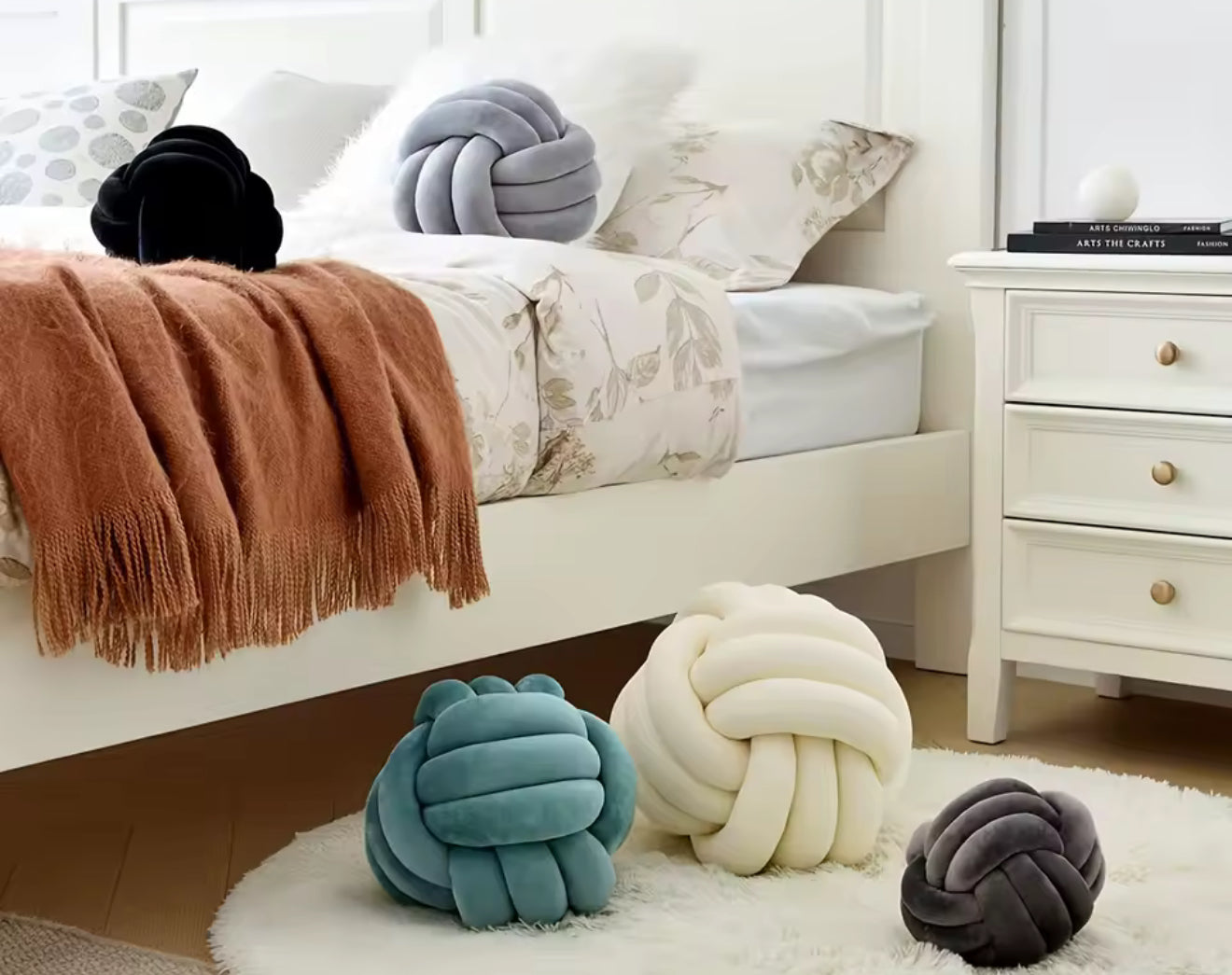 Knot knut Kudde är en dekorativ accentkudde formad som en handknuten boll med sammetslen tyg och mjuk stoppning. Designen ger både personlighet och textur till rummet, perfekt för att skapa en lekfull men ändå elegant touch i sovrum, vardagsrum eller barnrum.