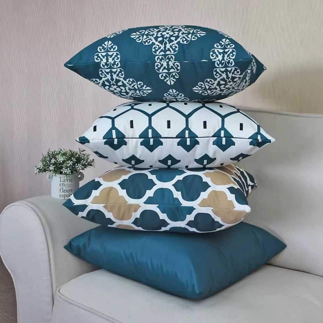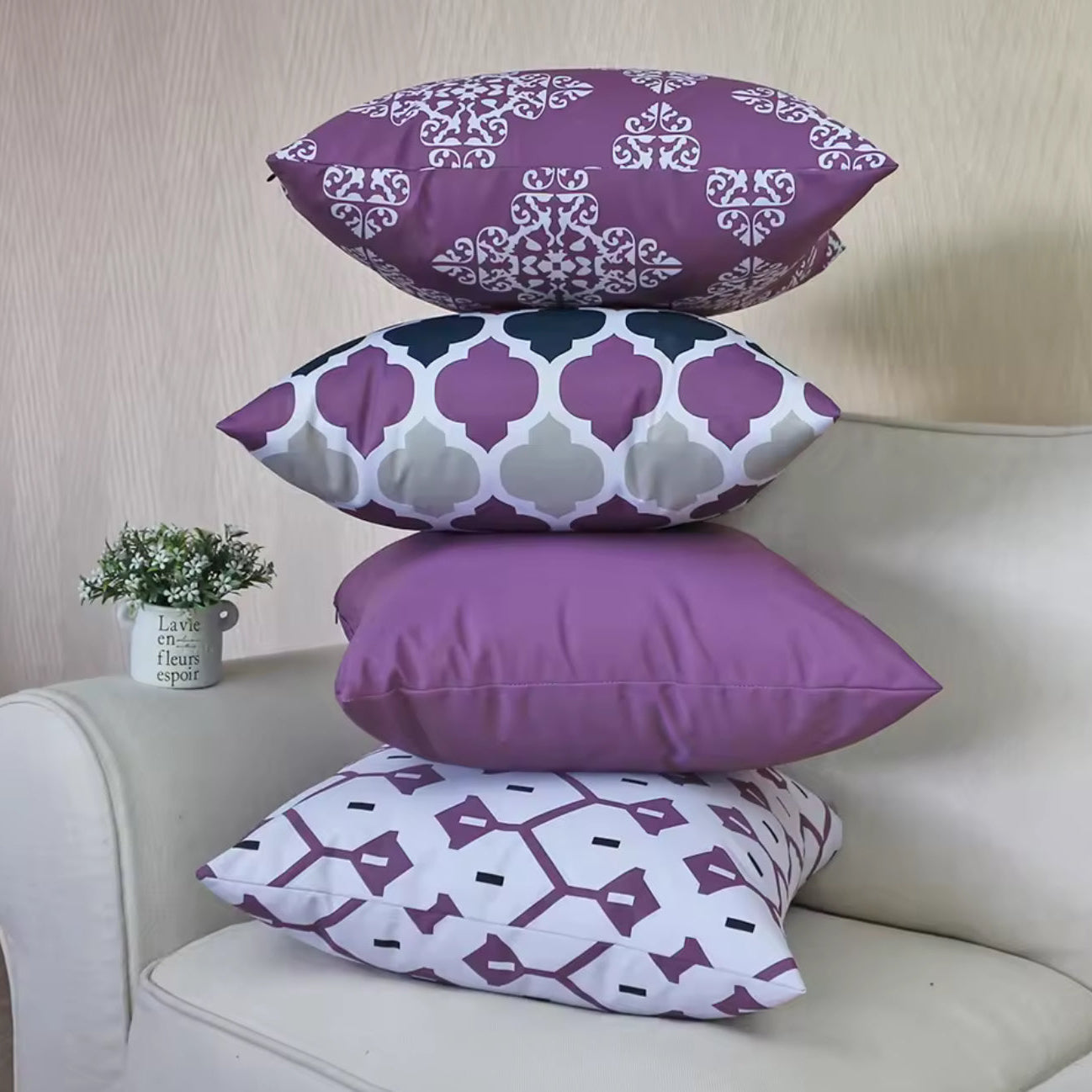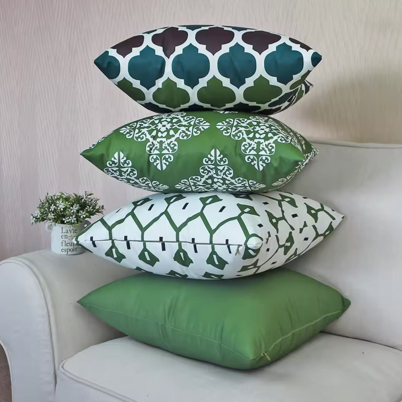 - Placera de största storlekarna (50×50, 60×60) längst bak och bygg på med mindre kuddar framför för en hotellinspirerad bäddning.