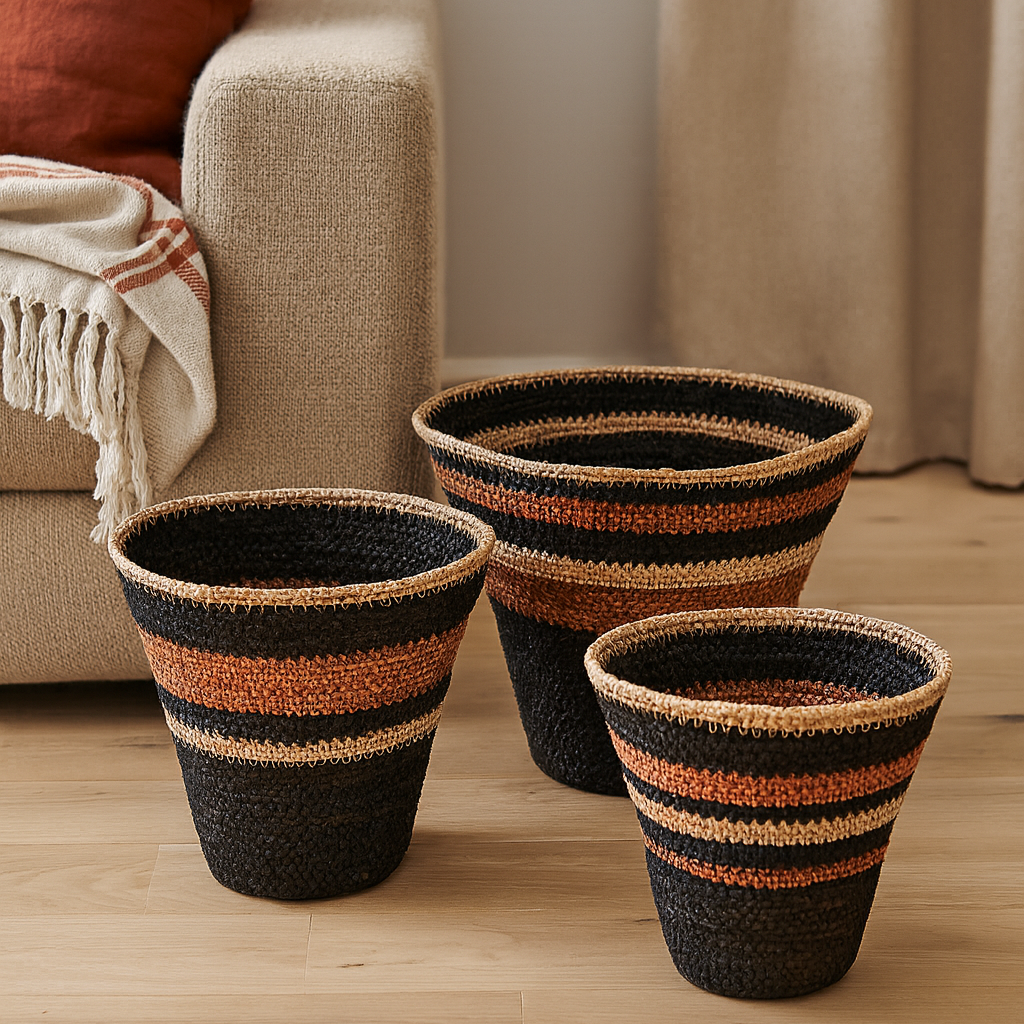 Lyft fram värmen och karaktären i ditt hem med våra MADIBA korgar, ett set om tre handgjorda korgar i vackra naturfärger. De jordnära tonerna i svart, brun och beige skapar en harmonisk känsla som passar lika bra i det moderna hemmet som i en mer bohemisk inredning. Korgarna är både funktionella och dekorativa, perfekta för att samla upp vardagens småsaker samtidigt som de blir ett stilfullt inslag i rummet. Den generösa formen gör dem praktiska för allt från filtar och kuddar till leksaker eller tvätt.