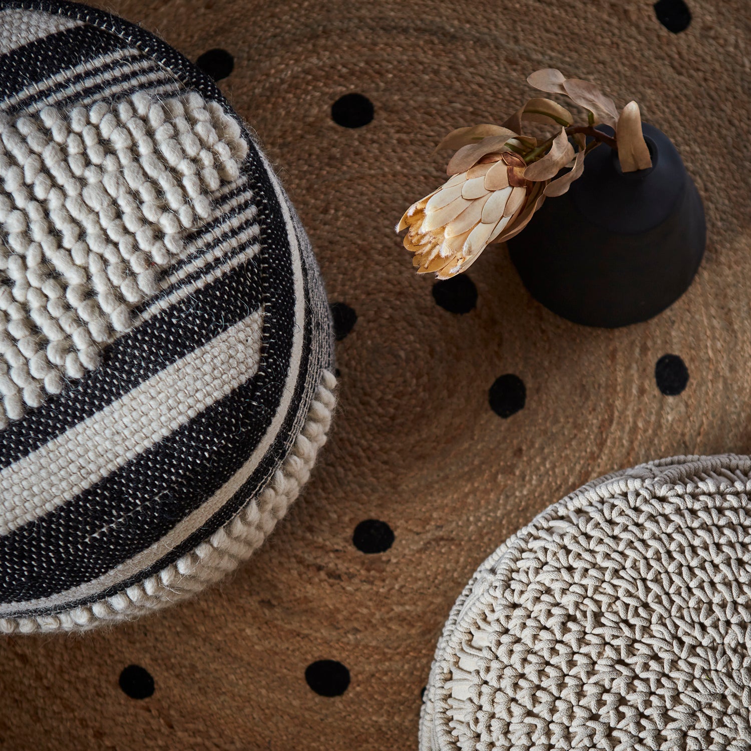 Låt puffen bli en mjuk övergång mellan ljusa möbler och golv, t.ex. med en matta i naturtoner. Kombinera med kuddar och dekor i liknande färger (Svart/elfenben) för en helhet som känns genomtänkt och ombonad.