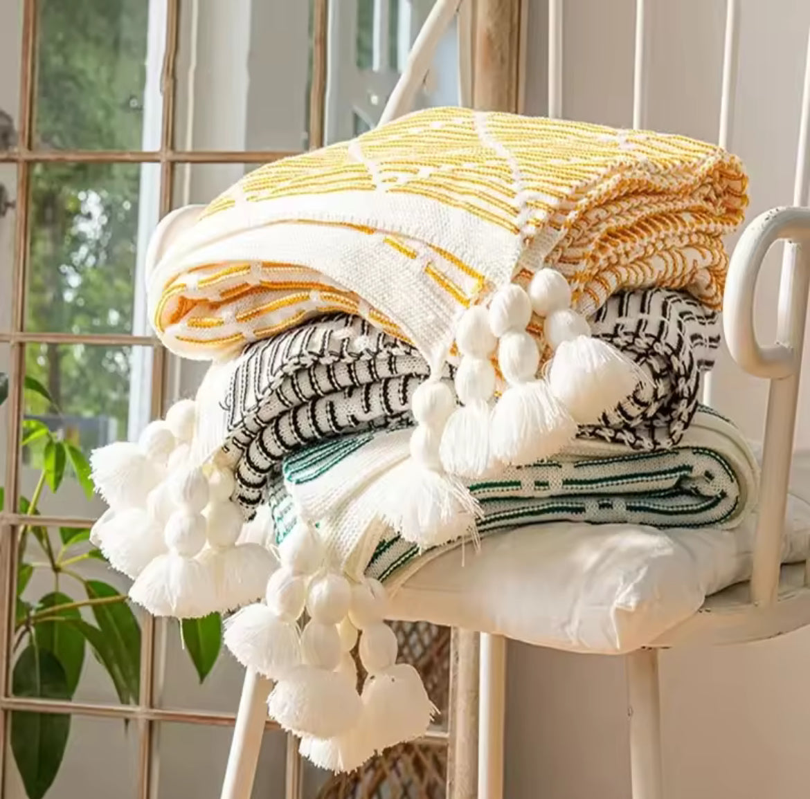Förvandla ditt hem till en oas av komfort med vår lyxiga filt med tofsar. Denna mångsidiga och eleganta pläd är designad för att ge värme, textur och en touch av sofistikation till varje rum. Perfekt för mysiga kvällar i soffan, som en dekorativt överkast på sängen eller som en fin accent på din favorit fåtölj så ger den dig en harmonisk, ombonad känsla.