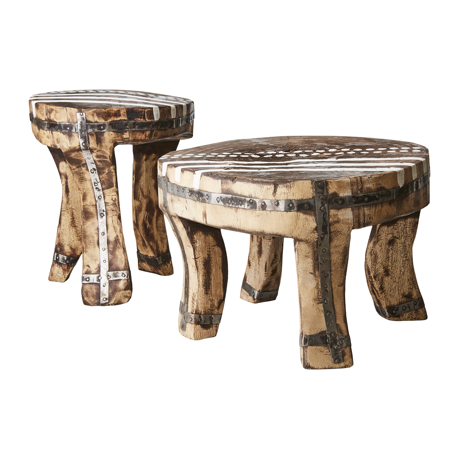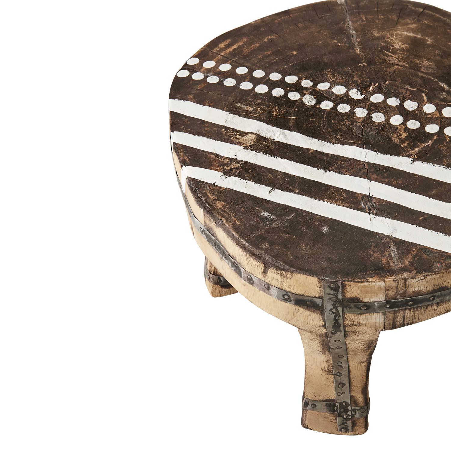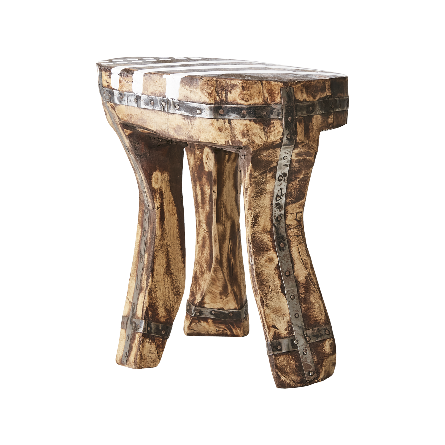 En unik pall med rustik karaktär och handgjorda detaljer som gör varje exemplar helt speciellt. Tillverkad i trä med robusta metallbeslag som skapar en känsla av vintage och hantverk. Den varma bruna tonen och det råa uttrycket gör att pallen både fungerar som ett praktiskt sittmöbel och som en dekorativ detalj i hemmet.
