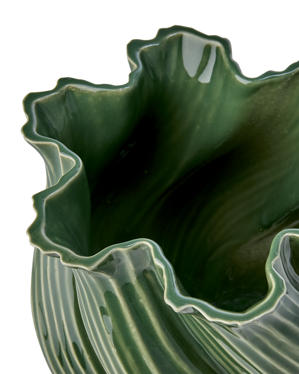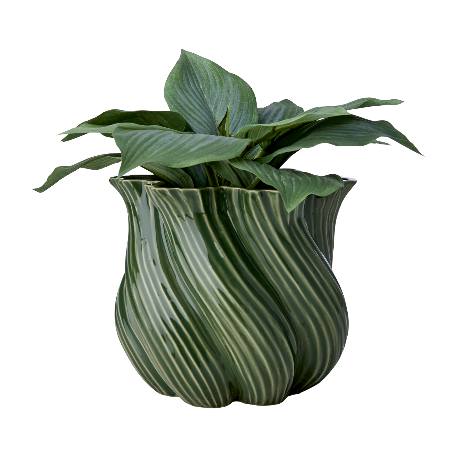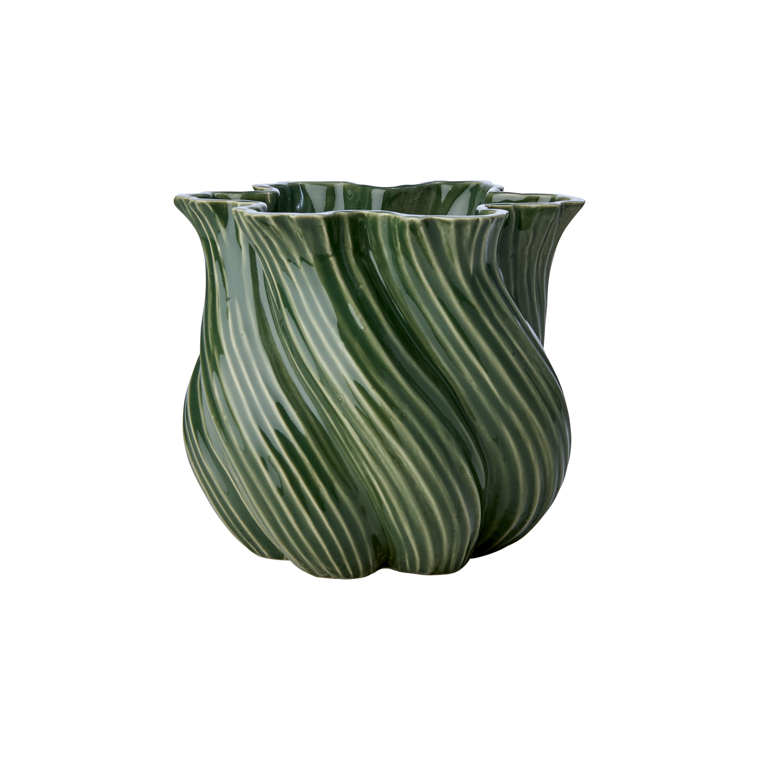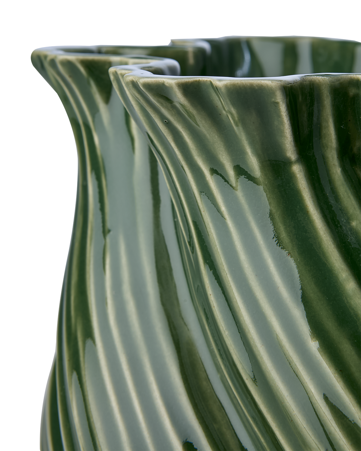 TWIST vas i grön nyans erbjuder en modern och elegant design som förhöjer ditt hems estetik. Tillverkad av stengods med en vriden form, skapar denna vas en dynamisk känsla i rummet. Dess vattentäta egenskaper gör den idealisk för både färska blommor och som en fristående dekorativ pjäs. Med måtten Ø20xH18 cm passar den perfekt på både matbord och sidobord