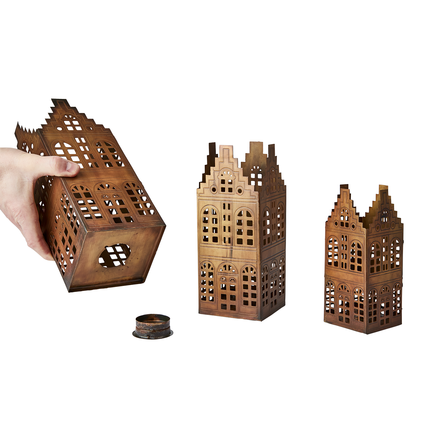 VILLAGE Ljuslykta hus, set om 3, Mässingsfärgad